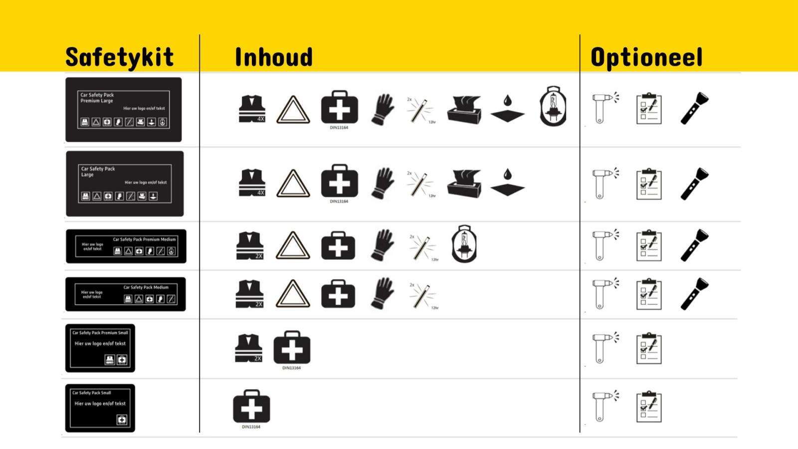 Tip: Ook extra producten die minder geschikt zijn voor in de tas – zoals een Lifehammer en een brandblusser – leveren we graag mee.